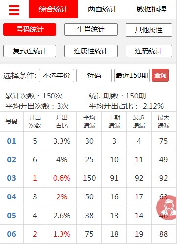 回到号码本身的统计,根据我们设定的参数,设定的统计位置为特码,如上图所示,最近150期内: