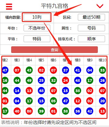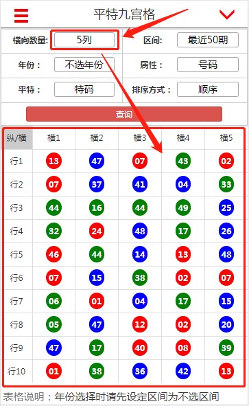 将指定年份或指定区间的开奖号码按照横向数量排列,纵向数量(或称Y轴)自动增减。