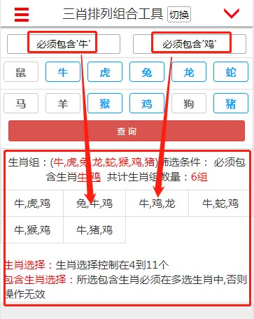 当两个条件参数选择默认都为“不设包含条件”,则该功能将对号码选择区域所选定的号码组按照指定的“2肖”(即分组时每组生肖2个)、“3肖”(即分组时每组生肖3个)、“4肖”(即分组时每组生肖4个)、“5肖”(即分组时每组生肖5个)、“6肖”(即分组时每组生肖6个)进行号码排列组合。
