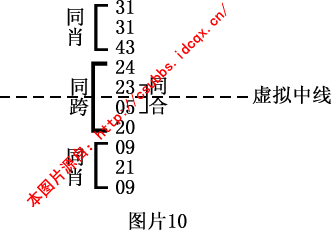 我们再从另一个角度来分析该月份的特码。若在23和05之间建立一条虚拟线(我们称之为“虚拟中线”其作用和中心点相同,不同的是它只是一条虚拟的线,而中心点是以单个或多个特码组成的属体。),则有图片10所示: